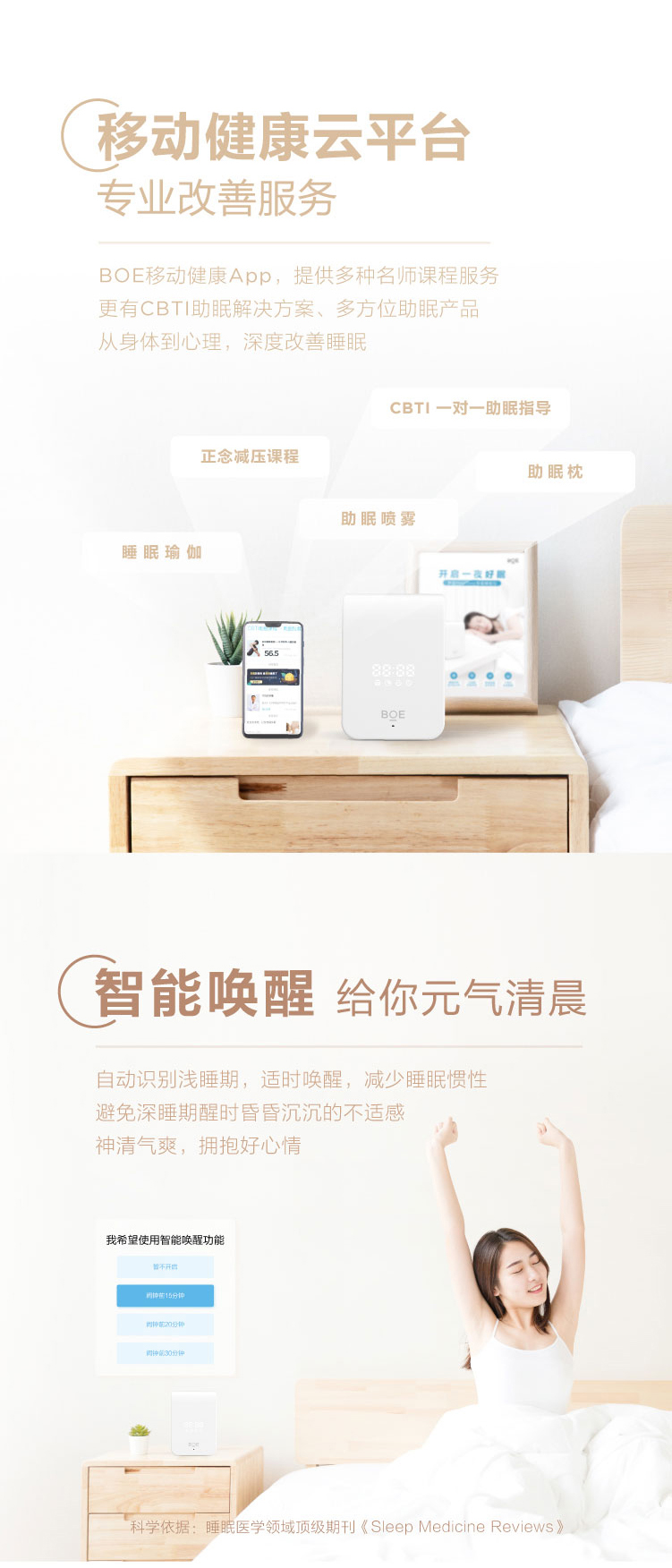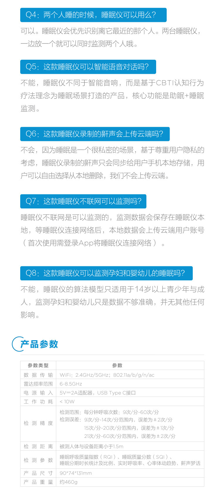 睡眠呼吸質量指數(RQI)、睡眠質量分數(SQI)、睡眠分期時長統計及比例、實時呼吸率、心率體動趨勢、鼾聲夢話