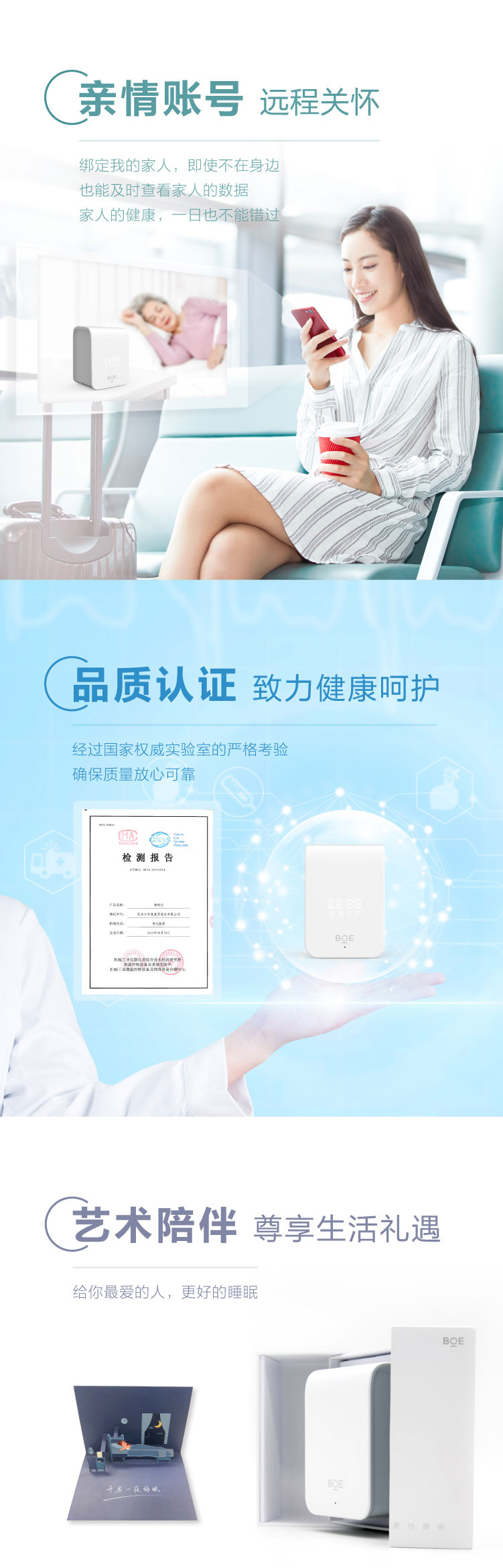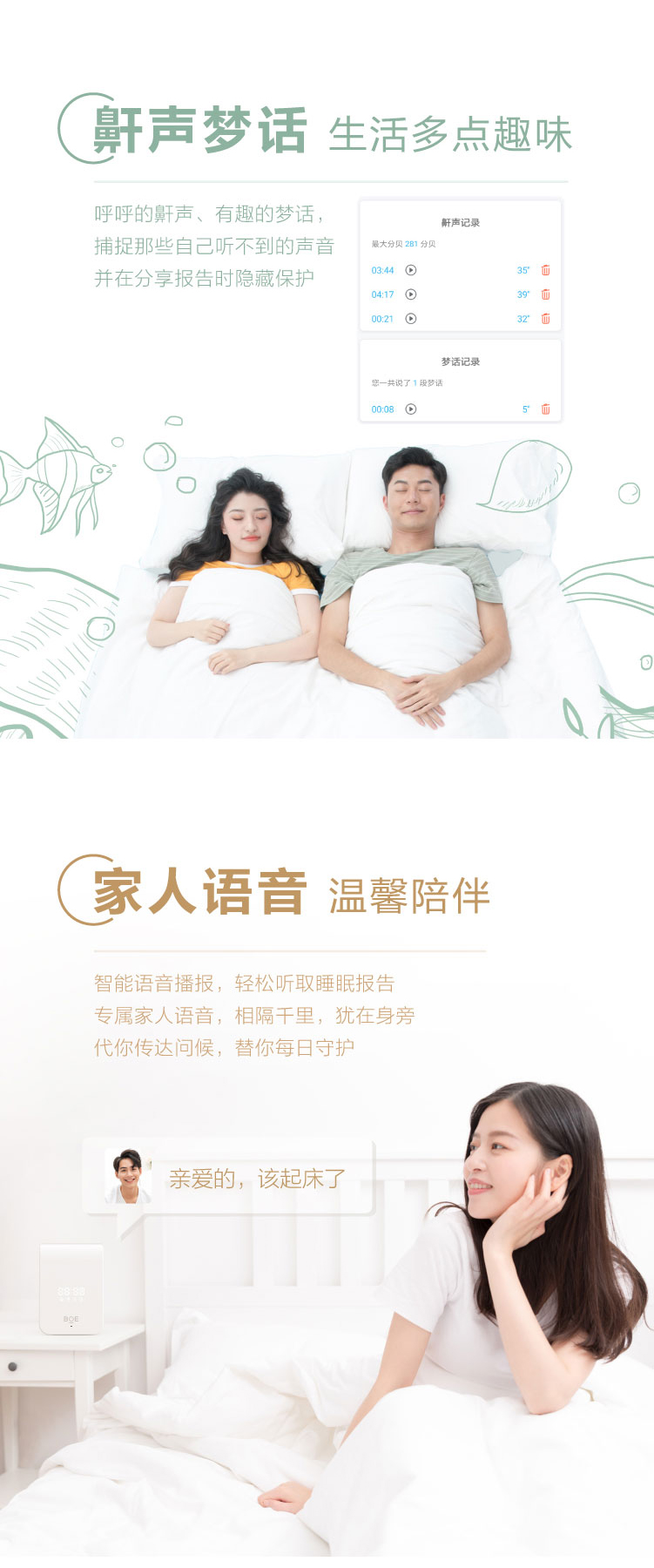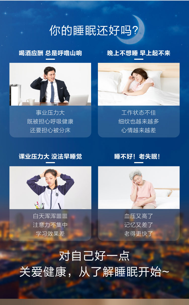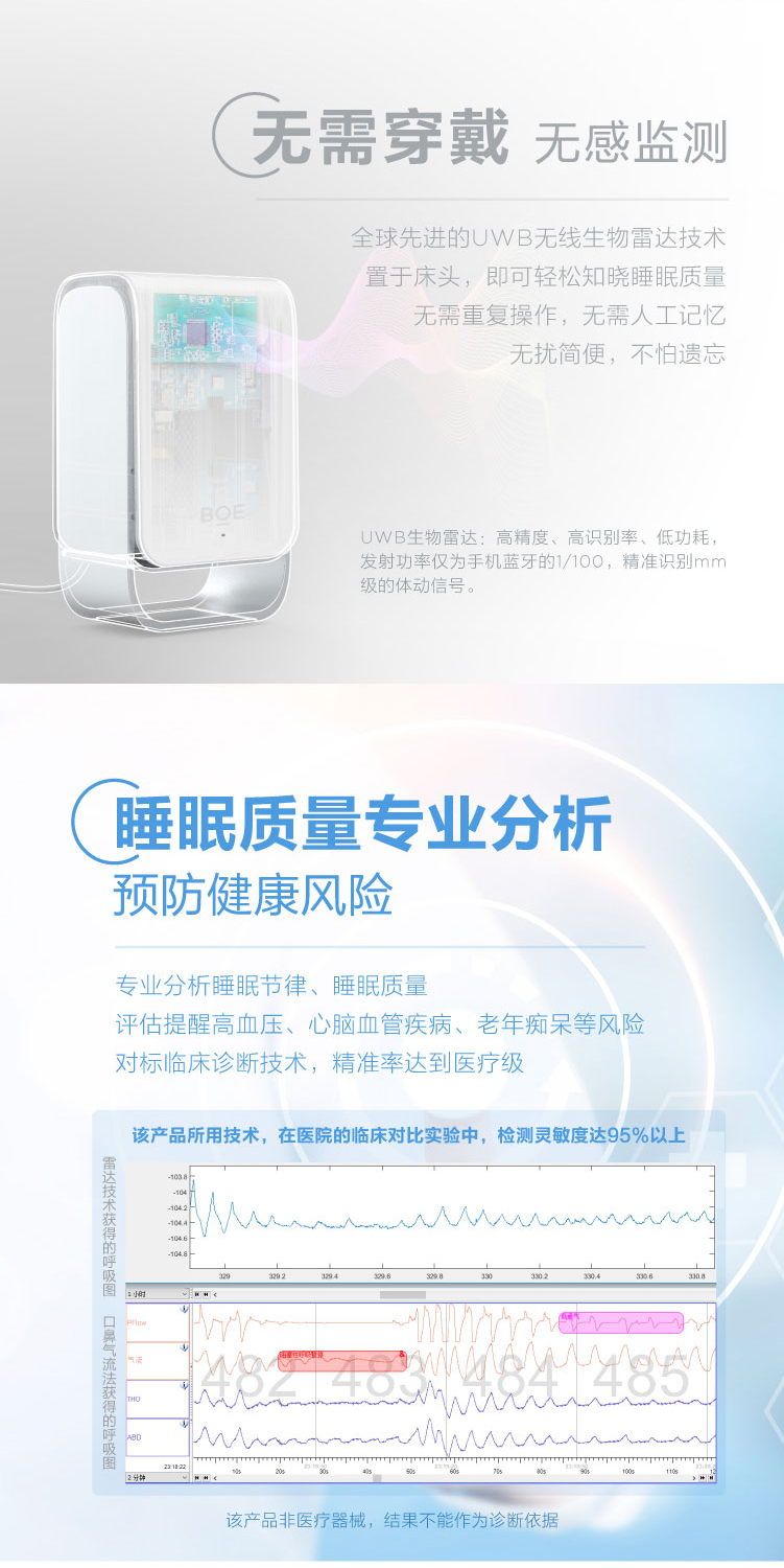 睡眠呼吸質量指數(RQI)、睡眠質量分數(SQI)、睡眠分期時長統計及比例、實時呼吸率、心率體動趨勢、鼾聲夢話